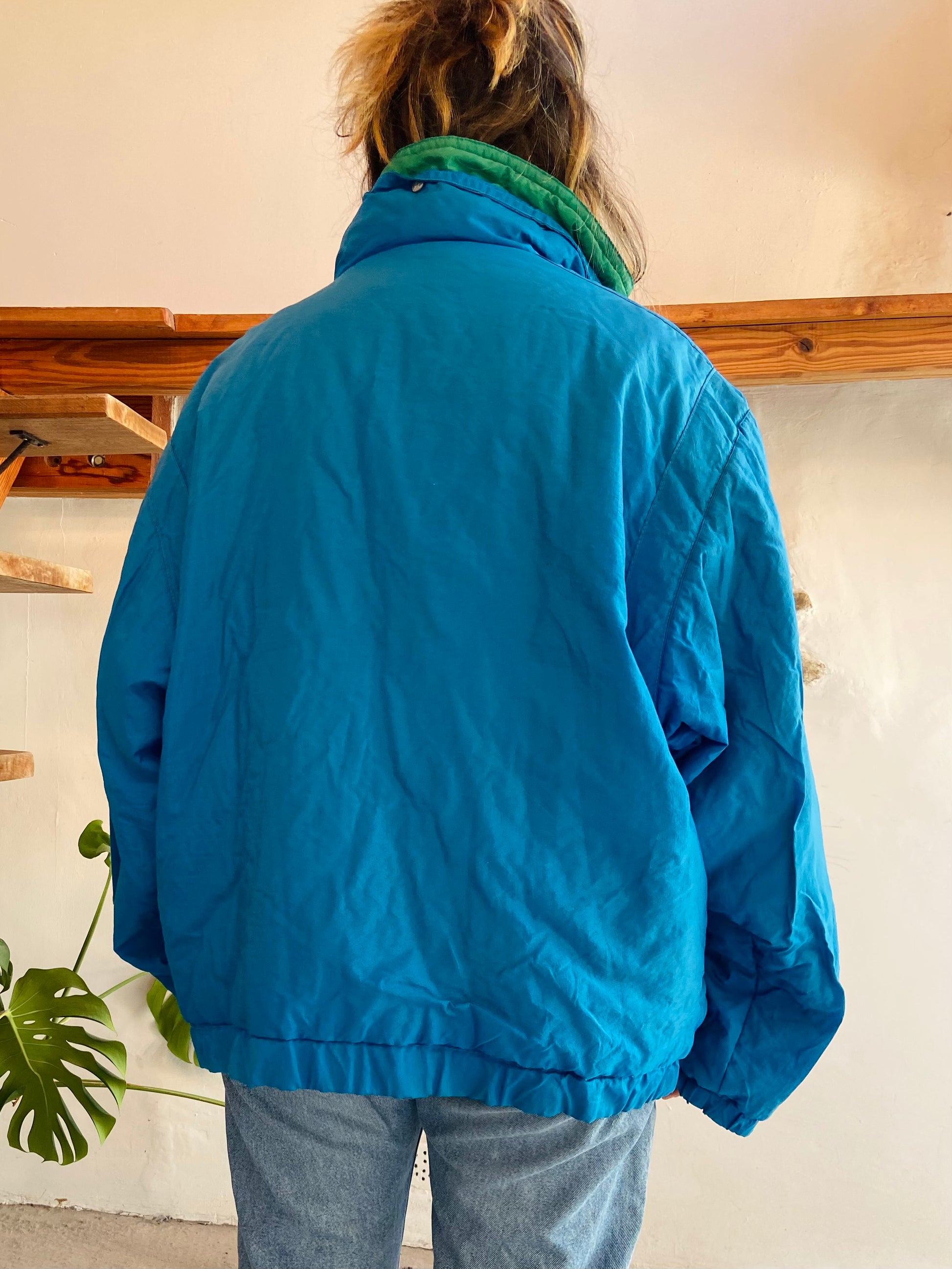 Vintage 80's amazing raincoat in a blue colour with green detail. Zip and poppers up the front and large zip pockets. Non stretch fabric.