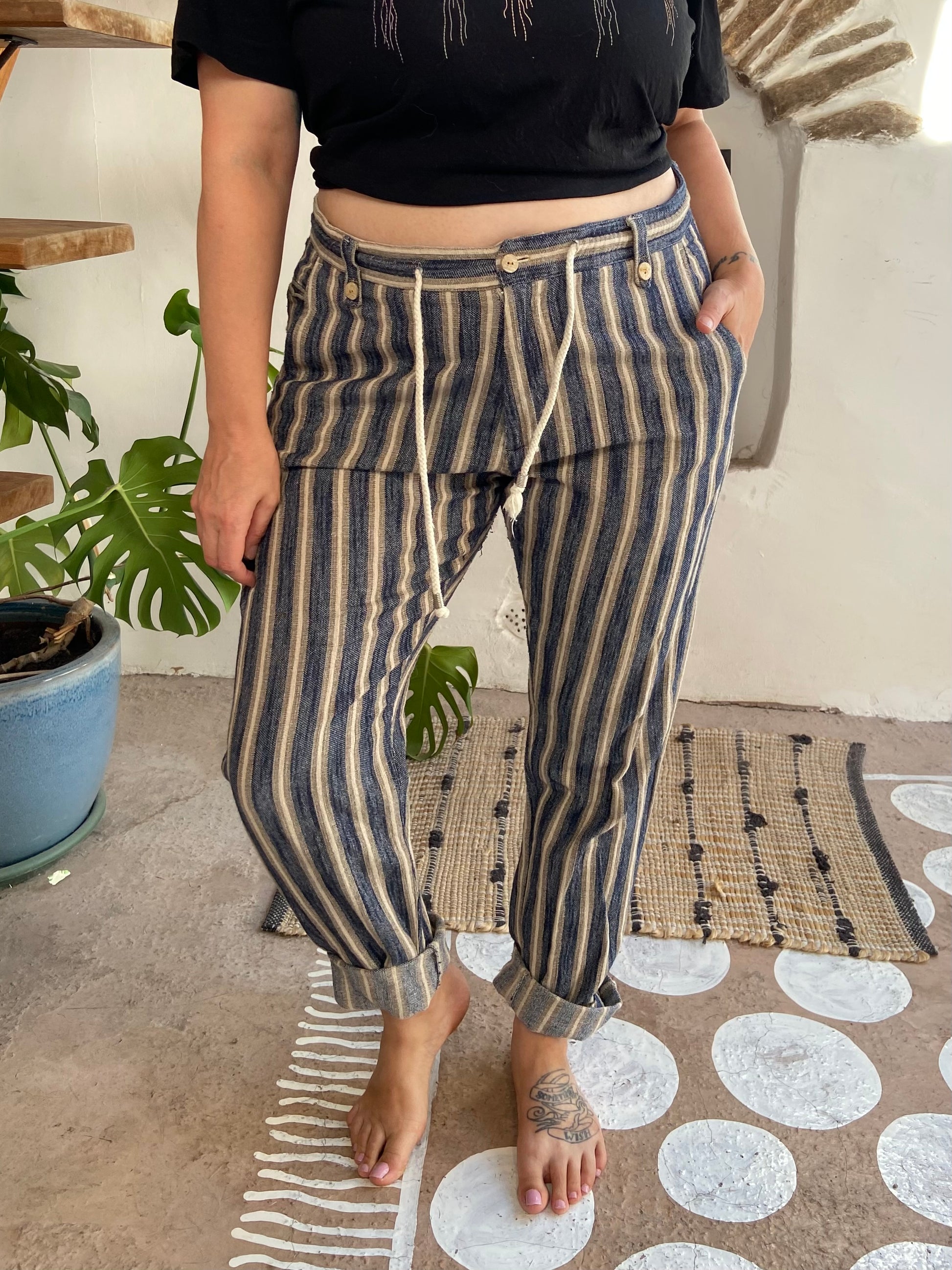 Vintage thick stripe trousers with a zip and button to do up. Side pockets and non stretch fabric.